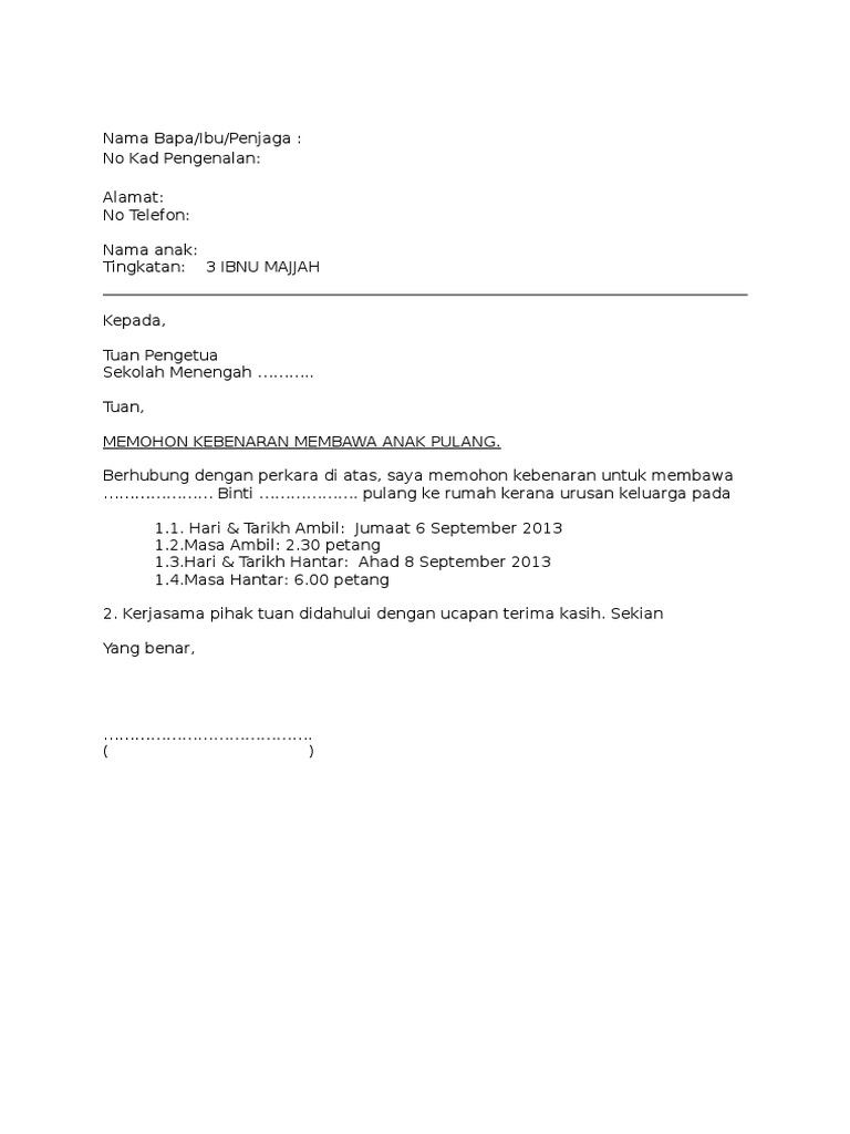 Save Save Contoh Surat Kebenaran Bawa Anak Pulang Asrama For Later. Salam sejahtera Harap maklum bahawa pemberian wang bantuan kerajaan untuk murid sekolah berjumlah RM10000 akan dibuat pada minggu terakhir persekolahan sesi 2011. Contoh Surat Wakil.